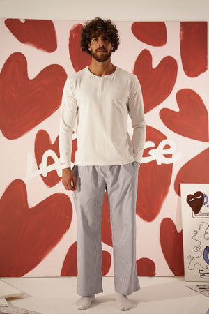 Designed for comfort and style, these grey and white striped Oxford cotton pants offer a relaxed fit with an adjustable drawstring waistband. Lightweight and breathable, they’re perfect for lounging in effortless elegance.