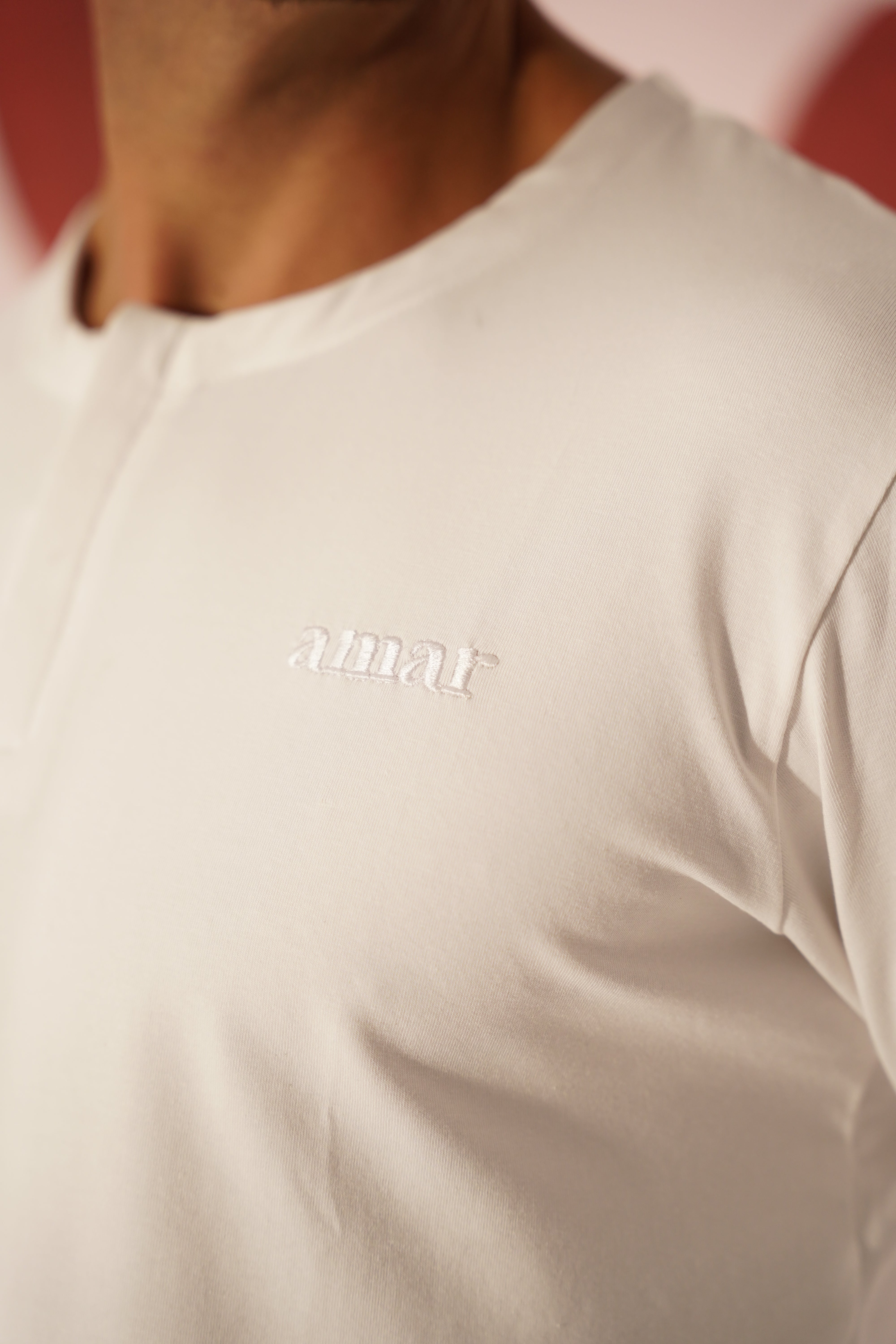 A relaxed-fit essential crafted from 100% cotton for effortless comfort. This white long-sleeve shirt features a round collar with hidden buttons and subtle red embroidery on the sleeve that reads "Love Language." Timeless, breathable, and easy to wear.