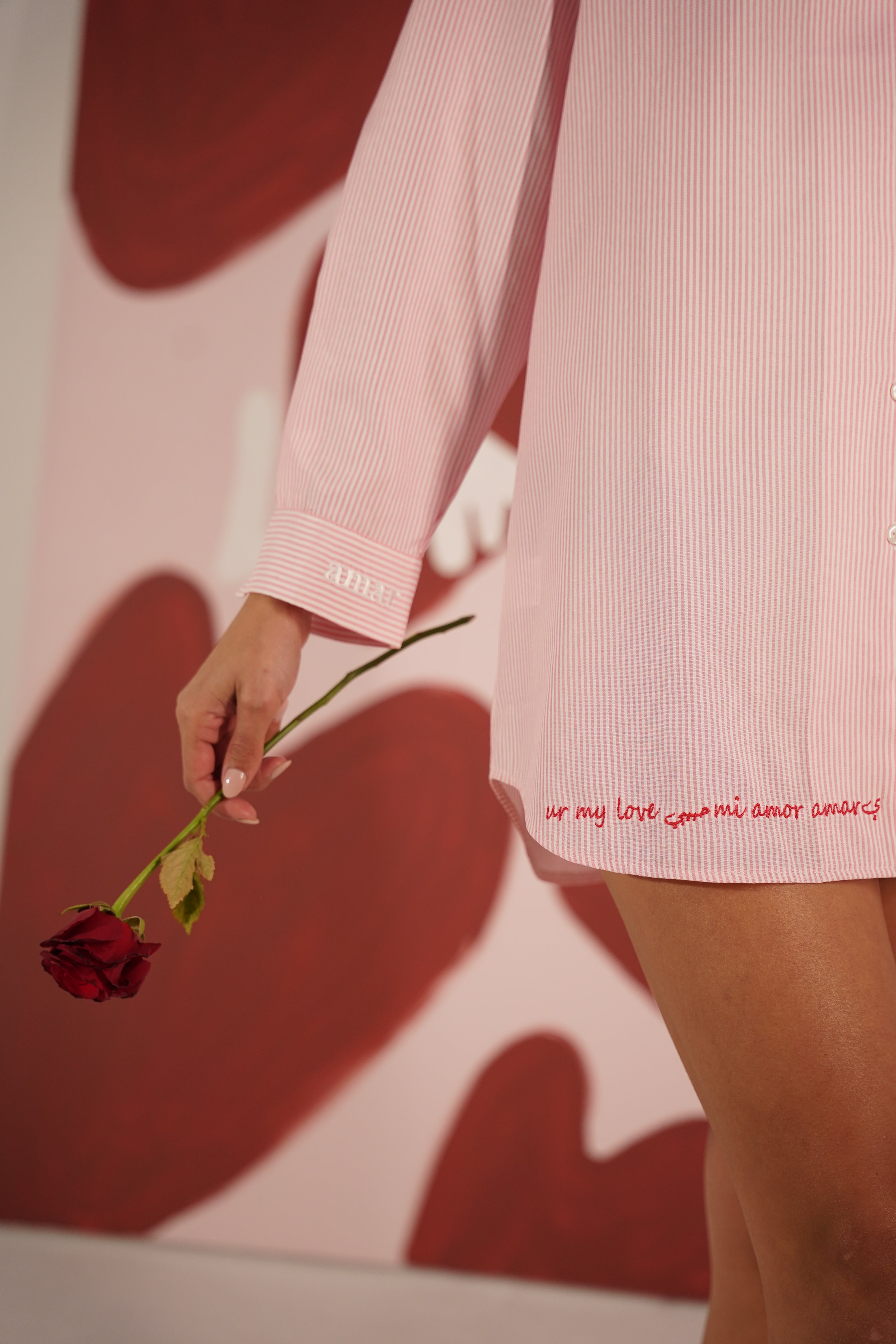 Crafted from premium Oxford cotton, this relaxed-fit shirt dress offers timeless elegance and comfort. Featuring a classic button-up design, it’s embroidered in red with "Love Language" on the chest and a beautiful phrase along the hem that celebrates love in multiple languages: "Ur my love, حبيبي, mi amor, amarي." A sophisticated piece with a meaningful touch